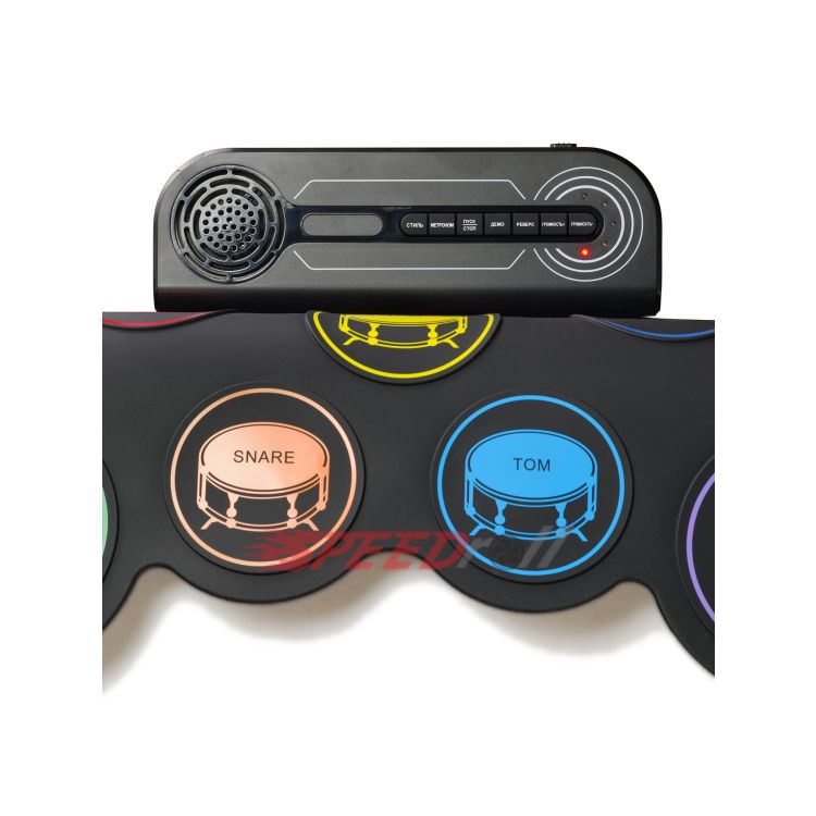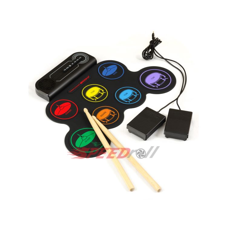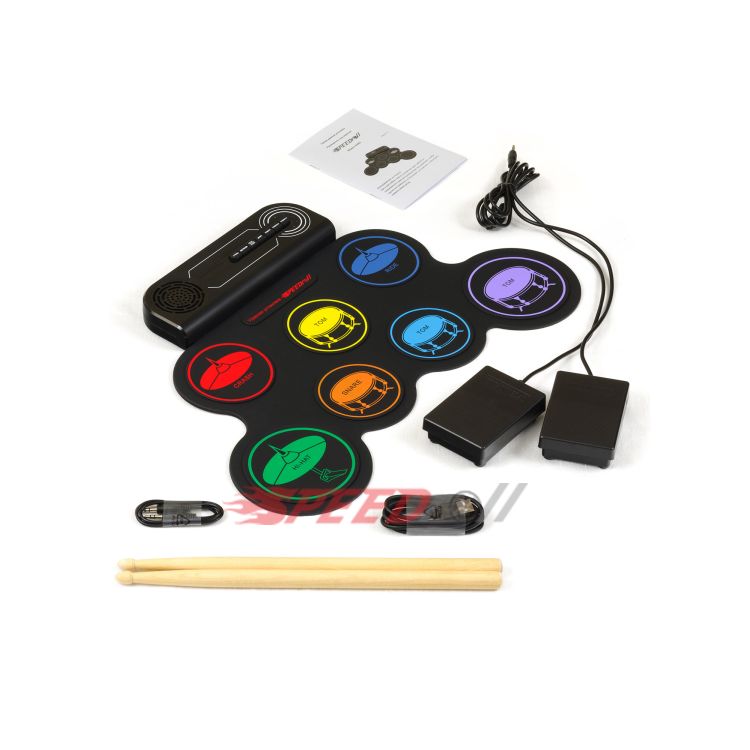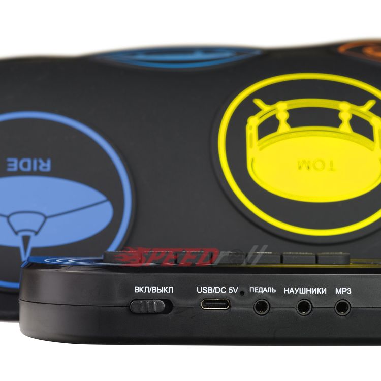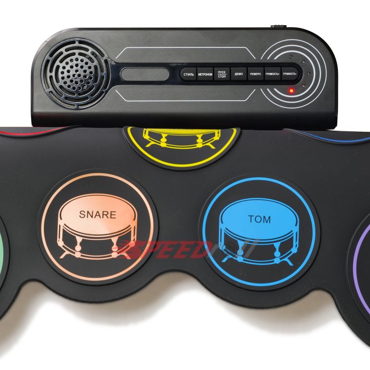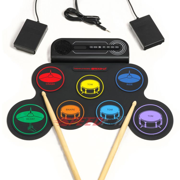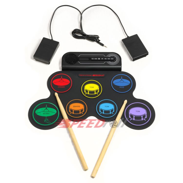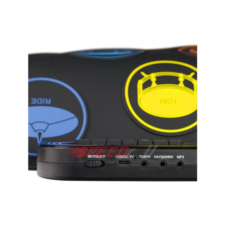 · Эффектная полноценная установка: 7 панелей с многоцветными тарелками (1 SNARE, 3 TOMS, 1 CRASH, 1 RIDE, 1 HI-HAT) и 2 педали (BASS DRUM, CLOSED HI-HAT).