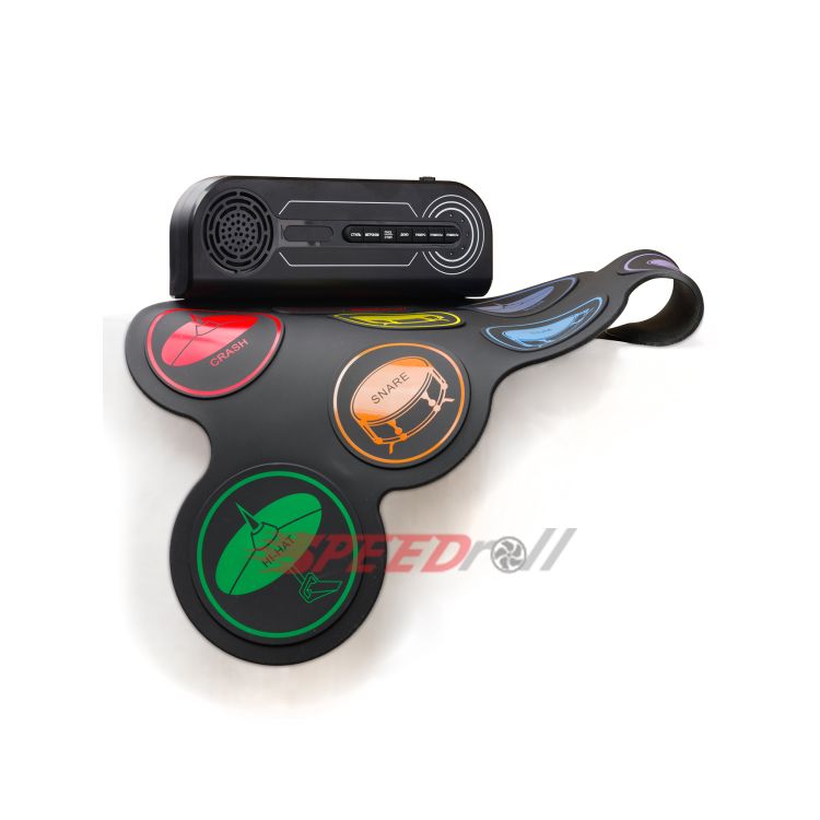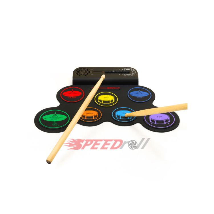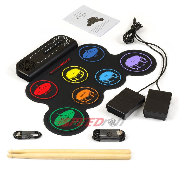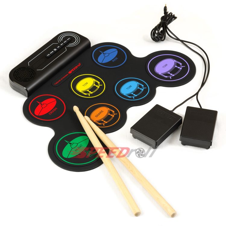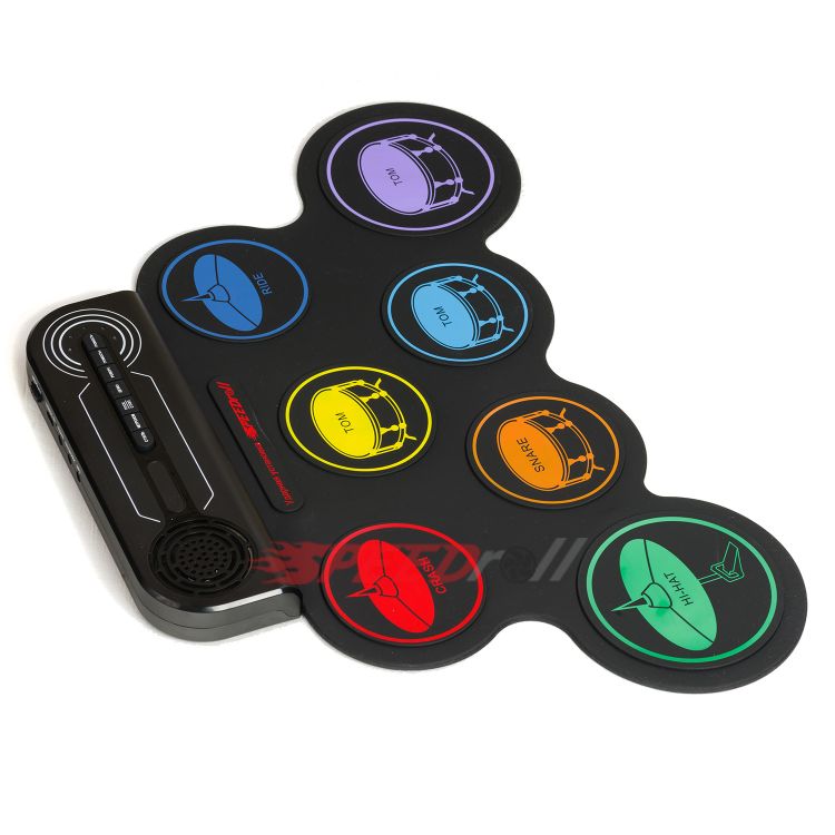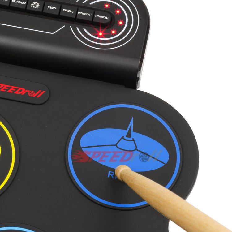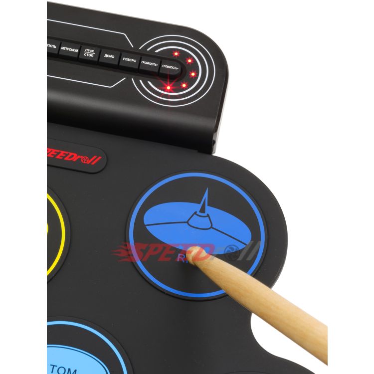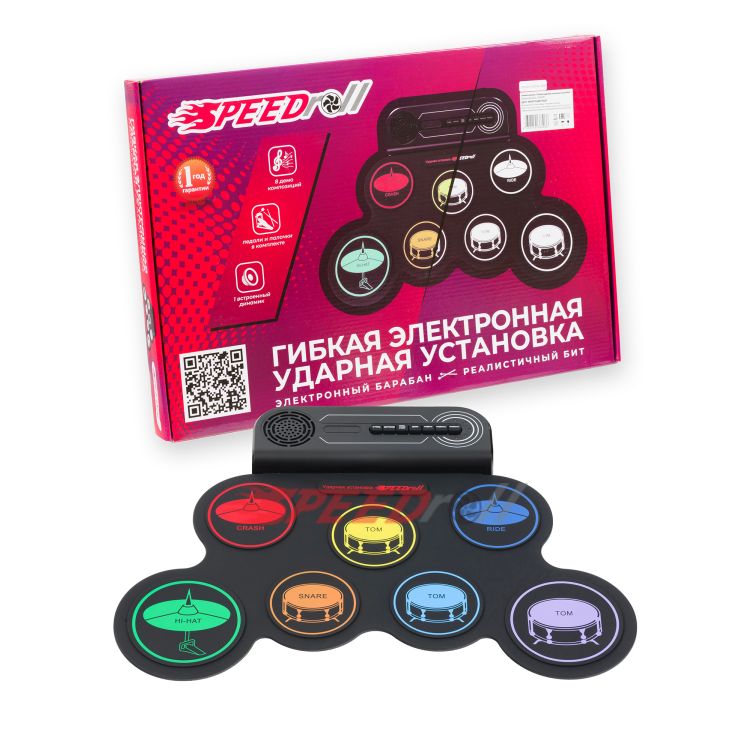 · Эффектная полноценная установка: 7 панелей с многоцветными тарелками (1 SNARE, 3 TOMS, 1 CRASH, 1 RIDE, 1 HI-HAT) и 2 педали (BASS DRUM, CLOSED HI-HAT).