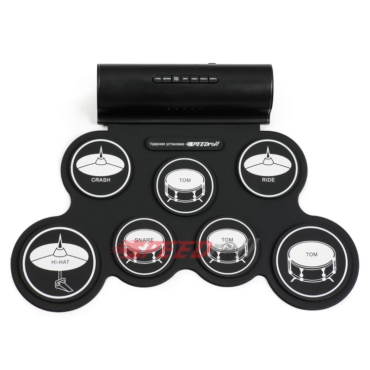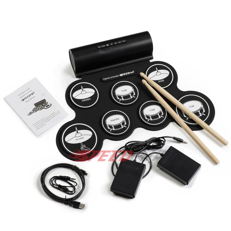 Гибкая ударная установка SpeedRoll G3006L — это устройство, разработанное для музыкантов и любителей барабанов, которые хотят играть на ударной установке в любом месте и в любое время. Идеальный выбор для музыкантов на ходу или для тех, кто хочет обучаться игре на барабанах без сильного шума. Подходит для всех возрастов и уровней мастерства. Ударная установка сделана из гибкого и прочного материала, что обеспечивает возможность складывания установки для удобного хранения и переноски. Данная барабанная установка поддерживает MIDI, благодаря чему ее можно подключать к компьютеру и записывать композиции. Есть возможность выбора стилей звучания, имеет 7 панелей, полный набор для слаженных ритмов; звук подается через два встроенных динамика мощностью 1.5 ватт каждый, а так же есть выход на наушники. Работает от сети, посредством подключения через адаптер или от встроенного литий-ионного аккумулятора.