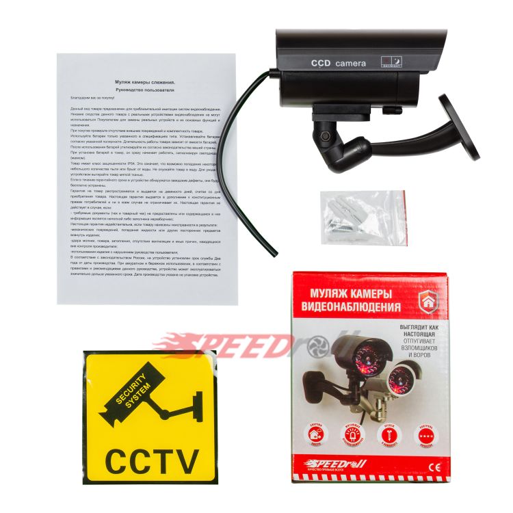 Комплектация: муляж камеры, саморезы для крепежа, наклейка предупреждение